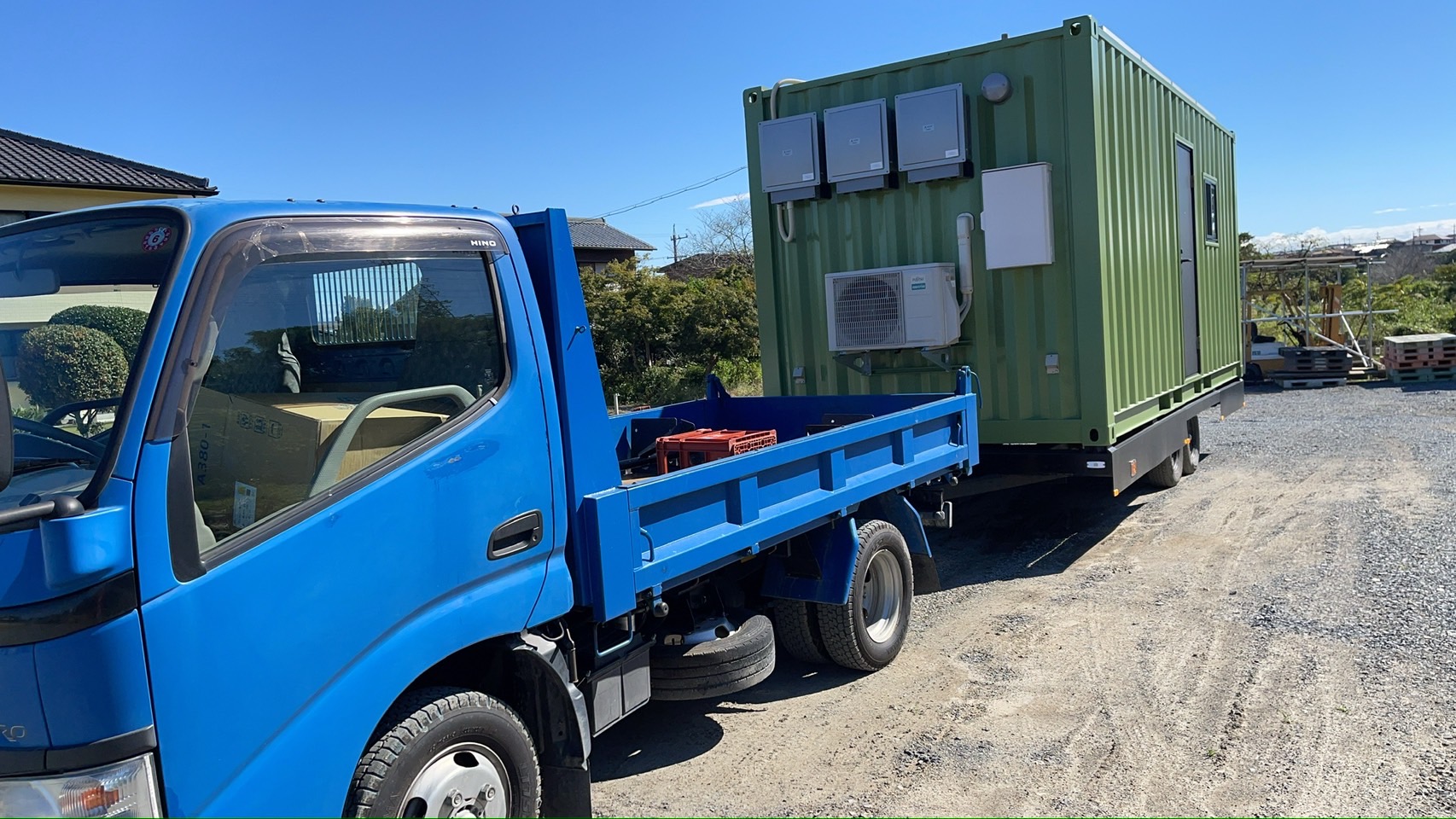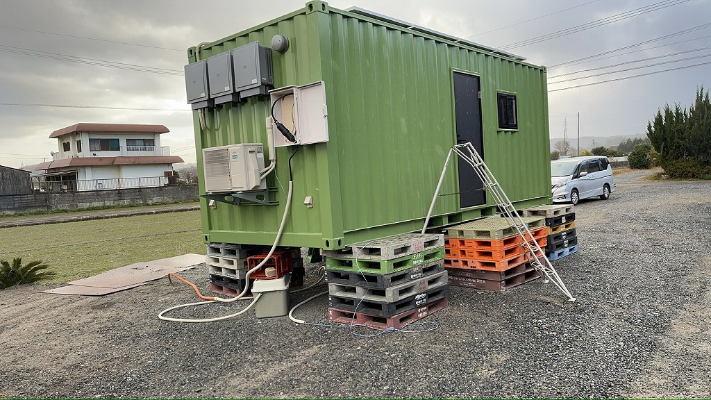 緑色のトレーラーハウスには、オムロン製の蓄電池(約10kVA)を搭載しており、外部との電力の受け渡しも可能です。