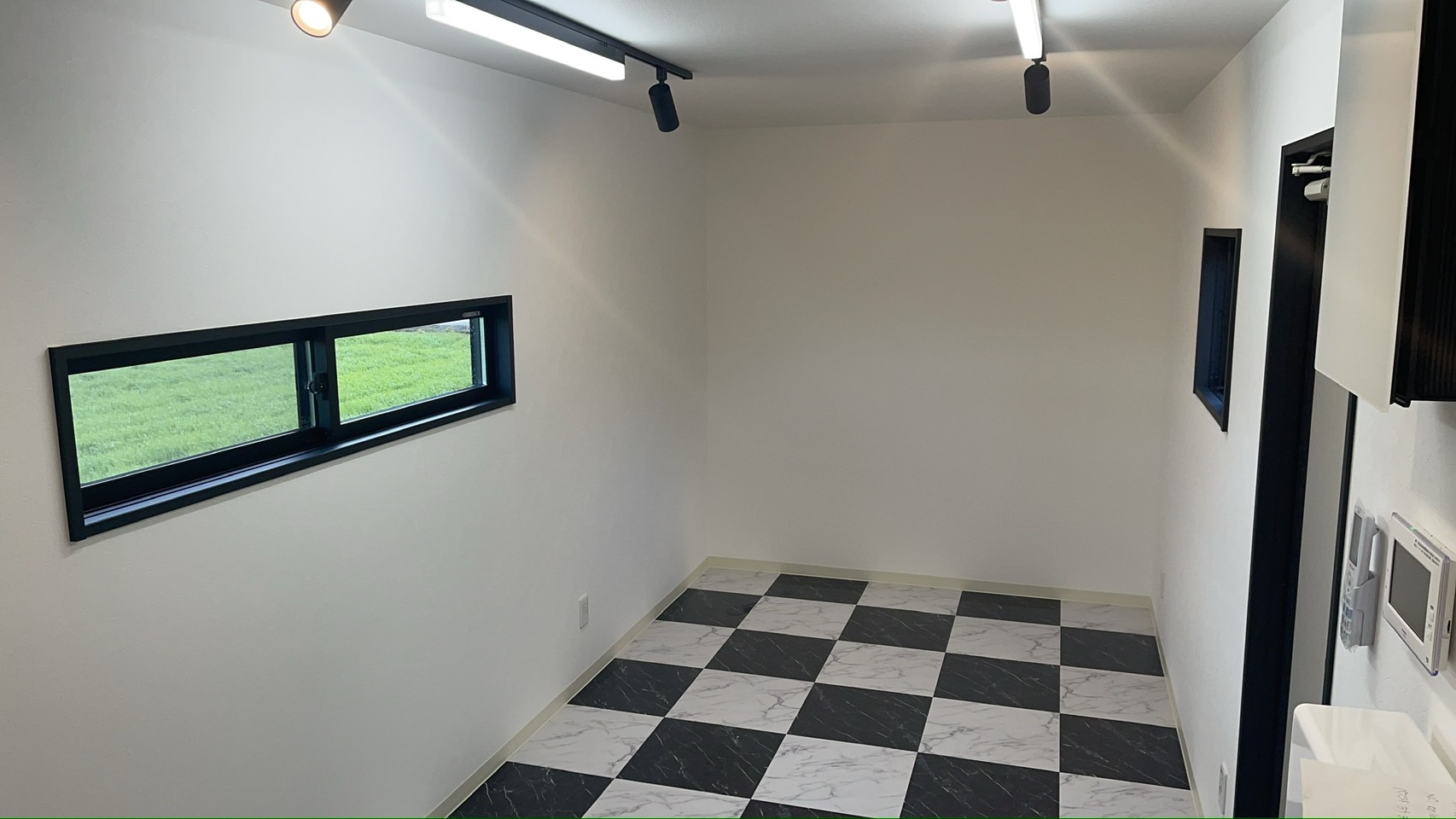 床材は白と黒の市松模様を採用し、モダンでスタイリッシュな空間を演出しています。